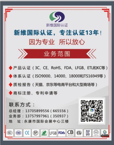 新維國際認證位于浙江永康市會展中心六樓,經(jīng)歷十五年風(fēng)風(fēng)雨雨,匯集成本地產(chǎn)品認證、體系認證和企業(yè)管理咨詢培訓(xùn)較大和較有實力的公司之一,業(yè)務(wù)范圍已經(jīng)擴展到全省,甚至到全國;公司擁有非常專業(yè)的認證專員、有實戰(zhàn)經(jīng)驗和專業(yè)的管理培訓(xùn)教練,公司擁有自己的檢測設(shè)備,方便產(chǎn)品預(yù)檢測。我們與德國TUV、瑞士SGS、英國ITS、法國BV、美國UL、中國質(zhì)量認證中心、中國中檢集團、中國家用電器研究院、國家玩具檢測中心、浙江立德、浙江方圓、北京中聯(lián)天潤和北京凱新等機構(gòu)建立了親密的合作伙伴關(guān)系。